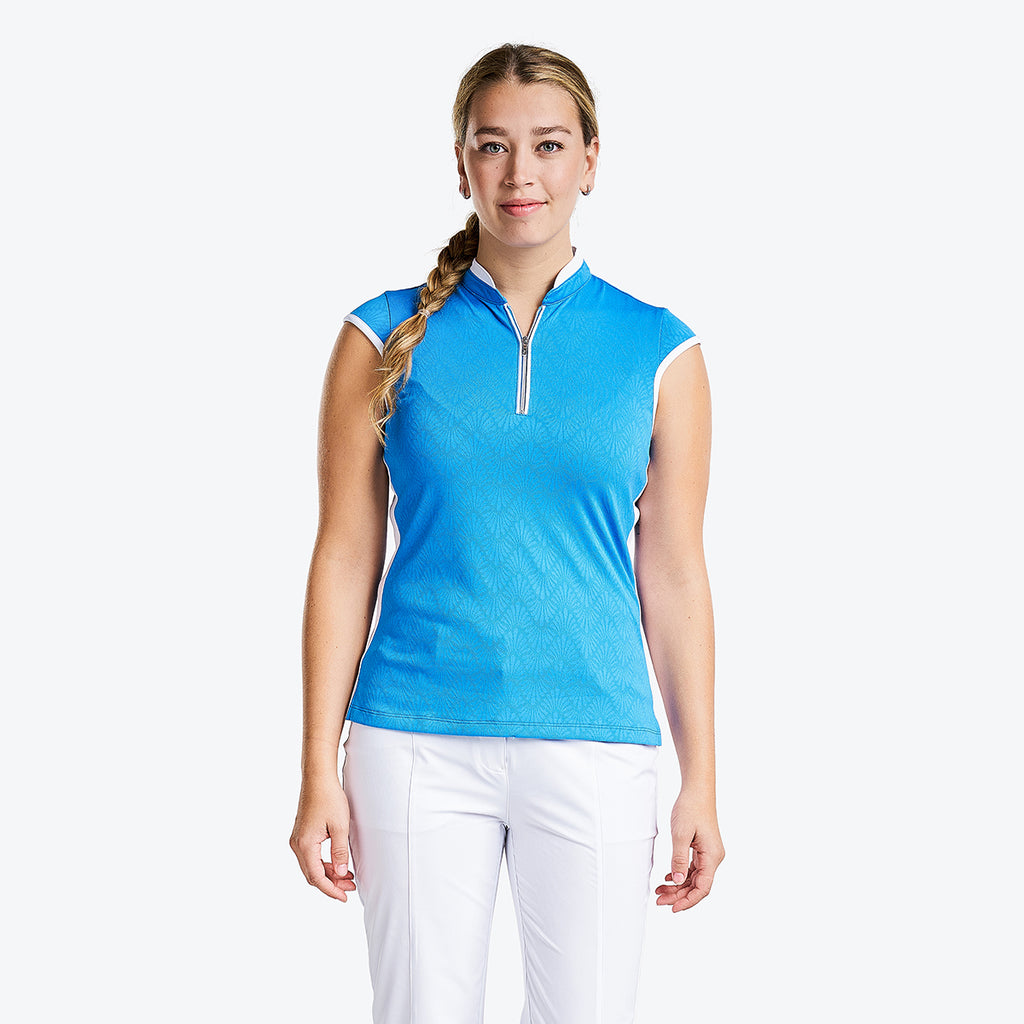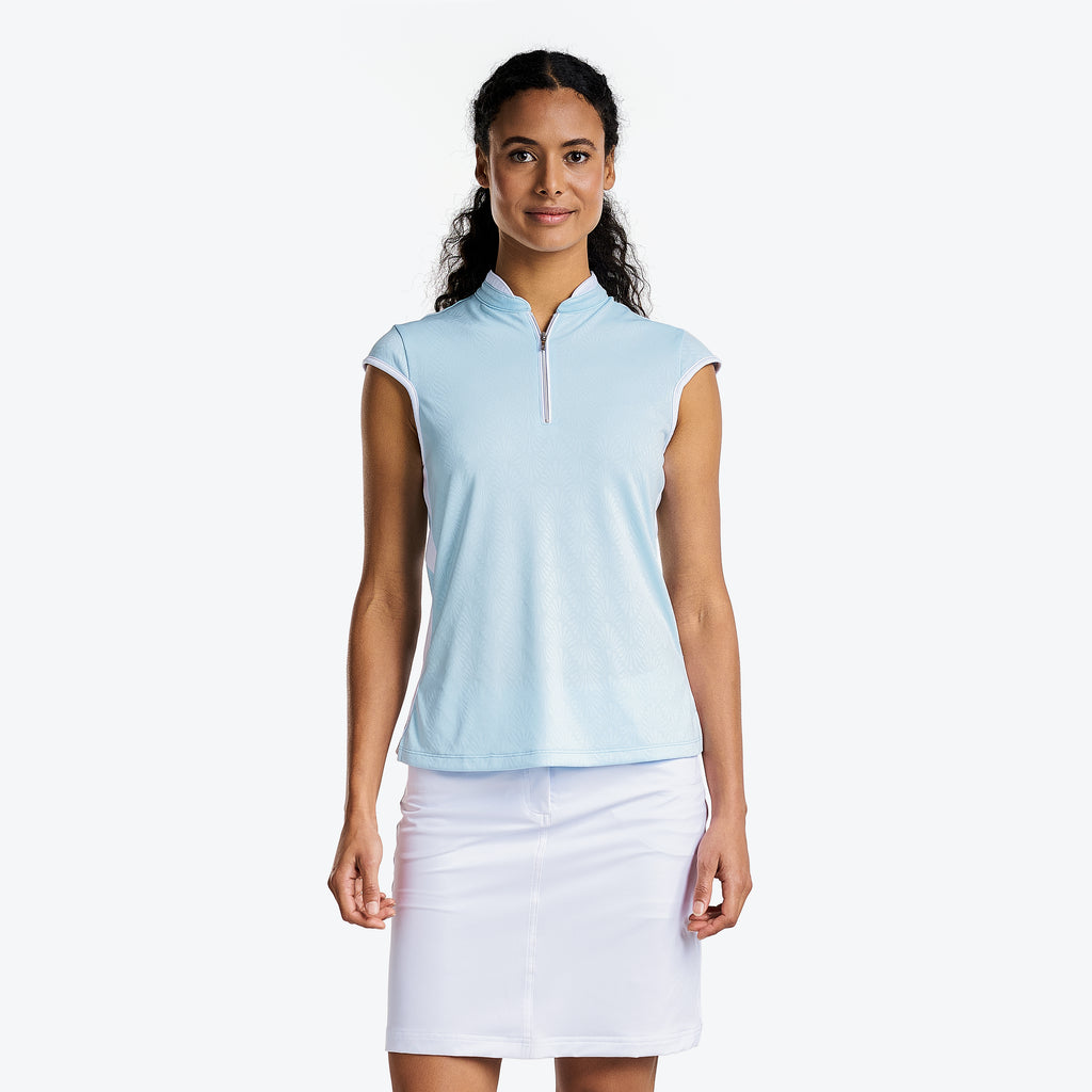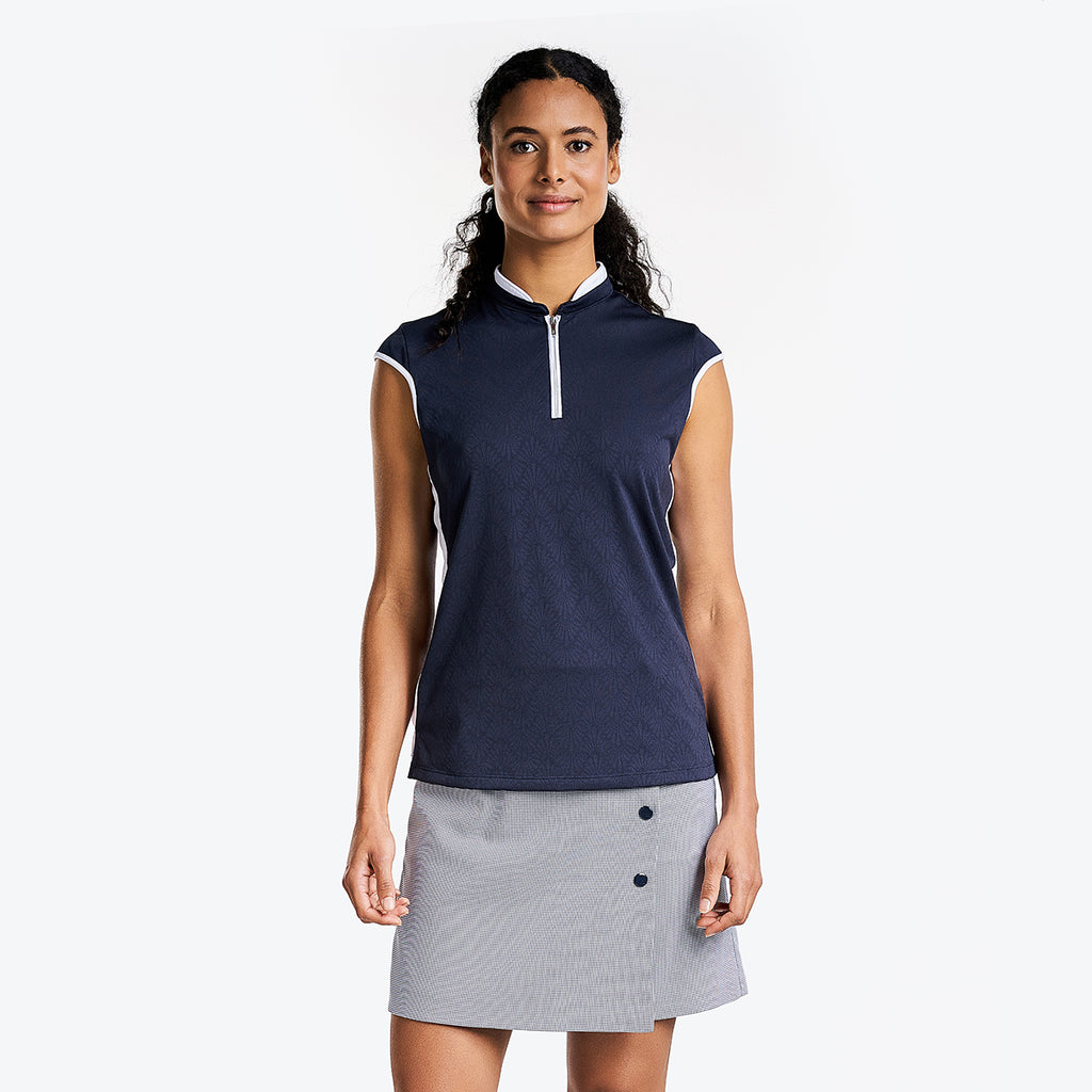 Perfect for those warm days on the golf course, the sleeveless Brianna mock offers a quarter-zip closure for an easy fit, keeps you fresh, and protects you from the harmful sun's rays with its sun protection UPF 40+ properties and quick-dry fabric. This sleeveless polo is made of jacquard fabric which gives a luxurious design and makes this mock golf ideal for winter and summer. The semi-fitted cut, contrasting side trims, and mock collar bring a sporty and dynamic look.