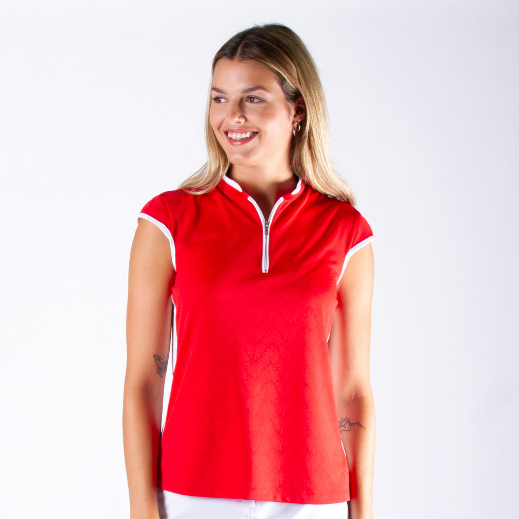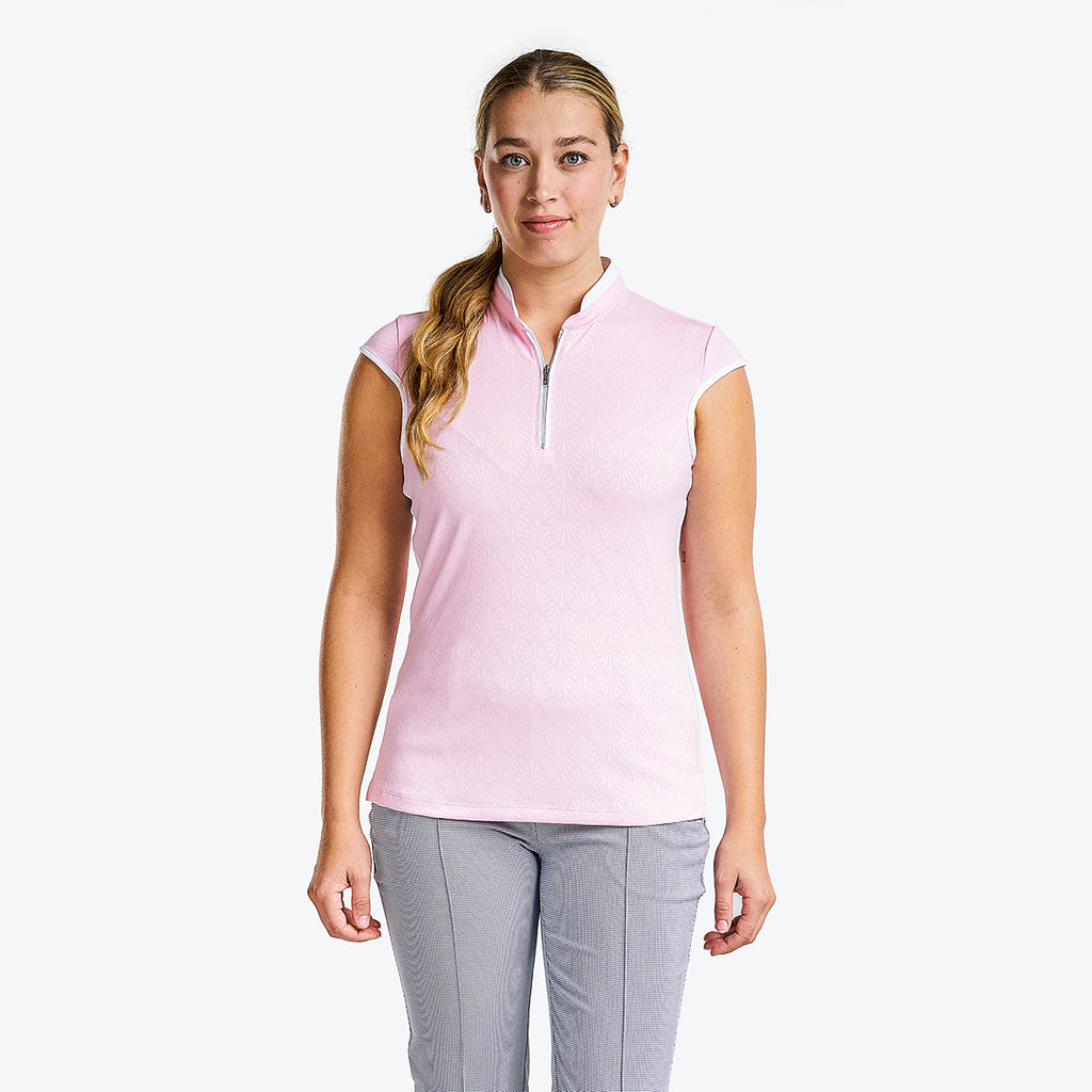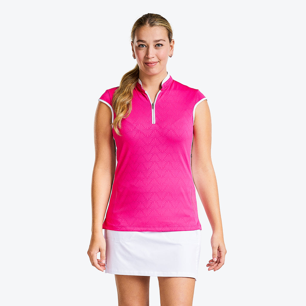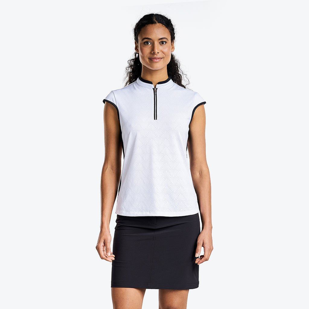 Perfect for those warm days on the golf course, the sleeveless Brianna mock offers a quarter-zip closure for an easy fit, keeps you fresh, and protects you from the harmful sun's rays with its sun protection UPF 40+ properties and quick-dry fabric. This sleeveless polo is made of jacquard fabric which gives a luxurious design and makes this mock golf ideal for winter and summer. The semi-fitted cut, contrasting side trims, and mock collar bring a sporty and dynamic look.