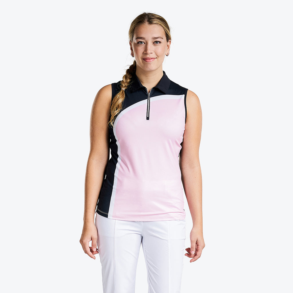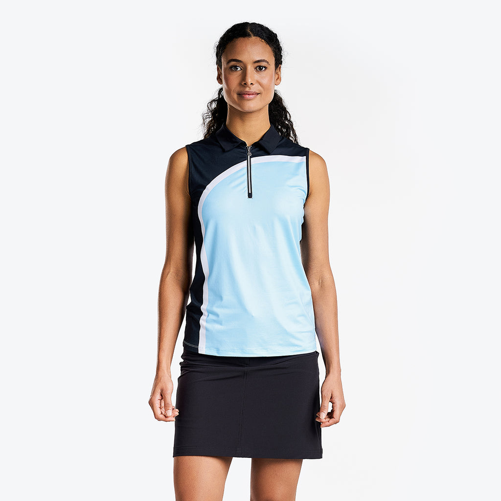 The Brynn golf polo shirt from NVO is ideal for hot days on the golf course. The wrinkle-free jersey of this sleeveless woman's golf shirt is durable, soft, and stretchy. Gain movement flexibility to take that perfect swing! The Brynn features an elegant and classic collar while a quarter front zip will makes this shirt easy to slip on and off over your head. Enjoy the Brynn polo today.