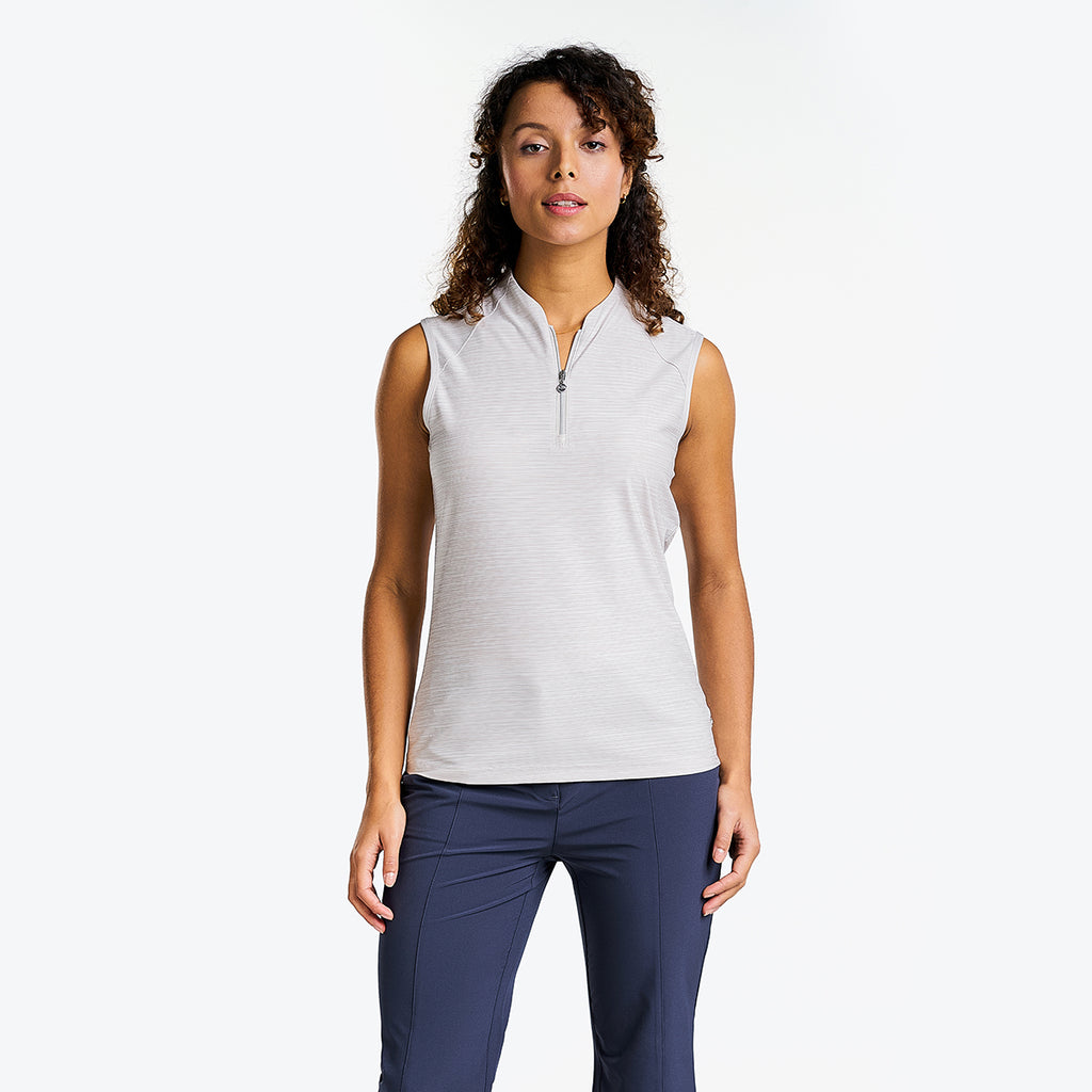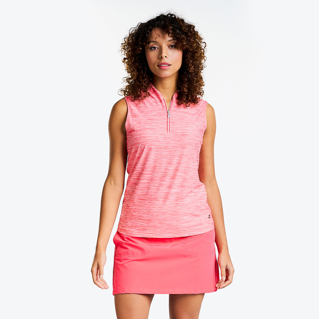 Introducing Cameron - a classy modern sleeveless golf mock from NVO! Made from 92% polyester and 8% elastane, this breathable, athletic sleeveless golf top for women is sure to keep you cool and comfy around long. The space-dye jersey fabric has superior moisture-wicking properties and provides UPF 30+ sun protection so that you can stay on top of your game. The lightweight design keeps you looking as cool as you feel, while the ¼ zipper closure allows for an adjustable fit. Whether you're hitting the green or enjoying a day out in the sun, Cameron is the perfect mock for any active woman with style.