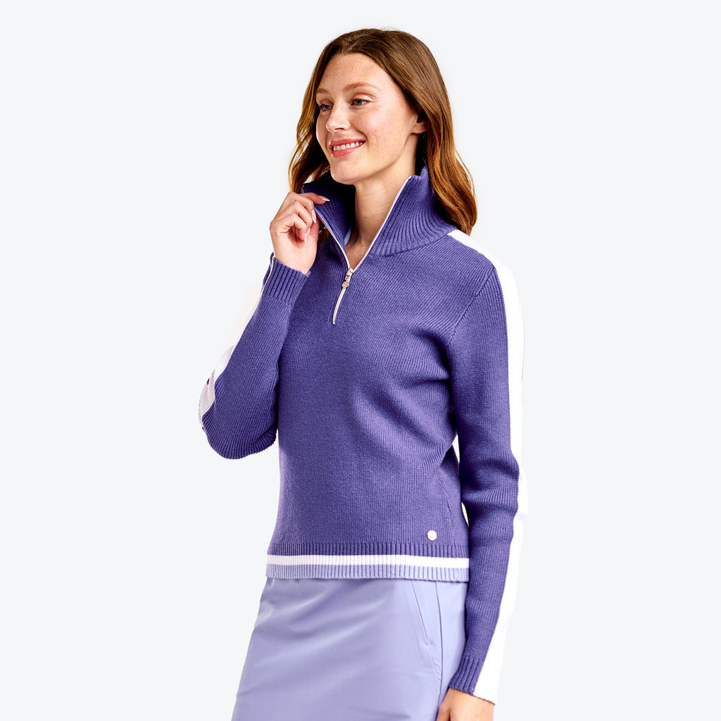 This knitted sweater with a semi-fitted cut combines comfort and style. Featuring contrast stripes at the shoulders, sleeves, and hem, it offers a modern and dynamic touch. With UPF 30+ sun protection, quick-dry properties, and moisture-wicking capabilities, it ensures optimal comfort both on and off the course.
