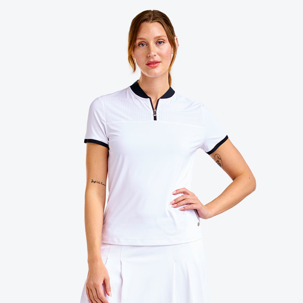 This short-sleeved golf top combines comfort and performance on the course. Its semi-fitted cut and laser-cut fabric on the front and back offer both elegance and breathability. The ribbed collar and cuffs, paired with a practical YKK zipper, add a modern touch. With UPF 40+ sun protection, quick-dry properties, and cooling effects, this top keeps you cool and dry even on the hottest days. The perfect choice for golfers.