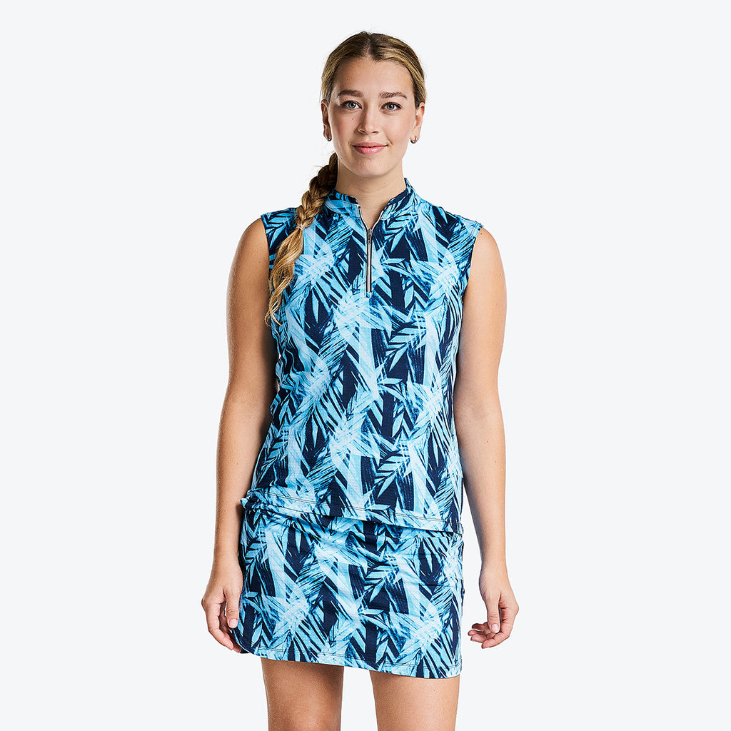 Are you looking for a high-performance and fashionable golf top? The sleeveless golf top Loy for women is the one you need. It is made of nylon, one of the strongest, durable and stretchy fabrics. It gives you more freedom of movement allowing you to focus on your game and be comfortable. Wicking moisture, cooling and breathable, the fabric evaporates humidity rapidly, so you feel fresh all day. No sweat marks on your clothes. Plus, this modern golf mock offers UV protection, reducing your risk of exposure to sun rays. Play your best game with the Loy mock from NVO.